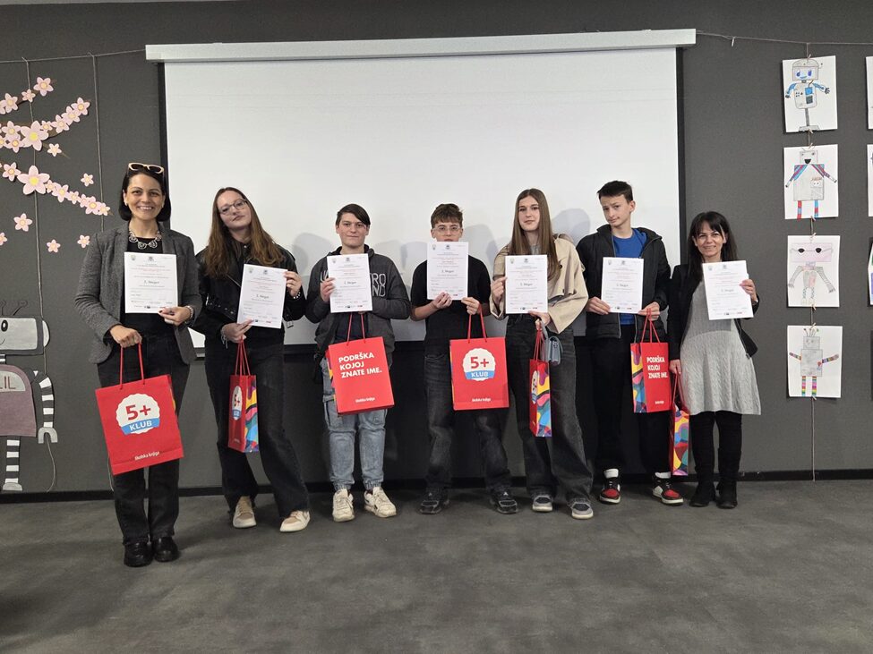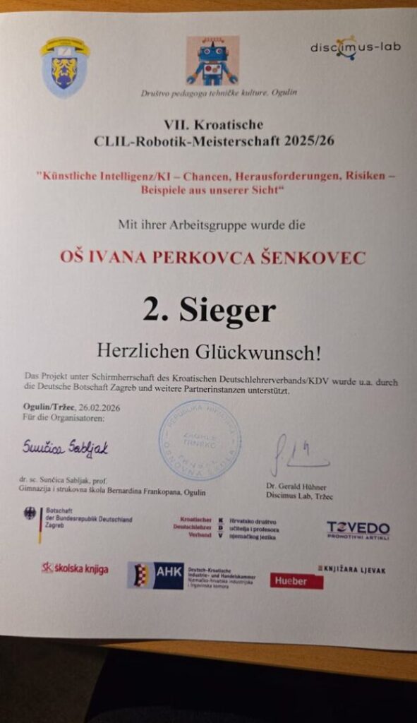 I ove godine u učenici naše škole uspješno sudjelovali na državnom Clil prvenstvu u robotici. To je natjecanje koje povezuje programiranje, robotiku i njemački jezik. Kako se to može povezati? Samo s puno kreativnosti i mašte. Baš tako su naši osmaši i jedan sedmaš pristupili i ovogodišnjem zadatku „Umjetna inteligencija , izazovi, potencijal i opasnosti!“ te su osvojili 2. mjesto i plasirali su se na međudržavnu razinu natjecanja koje će se održati u travnju 2026. godine. Iako su sudjelovali svi osmaši koji uče njemački jezik, glavninu posla odradili su Roko Mihaliček, Elin Miličević, Antonio Karajica, Mihael Šoštarič i Ema Škrbec. Naravno pod budnim okom učiteljice informatike Danne Merci za dio zadatka robotike i učiteljice njemačkog jezika Nikolina Žugec Lujić za dio prezentiranja uradka na njemačkom jeziku. Zajednički komentar je: „Dobro smo se zabavili, ponešto naučili i dobili zgodne poklone pokrovitelja.“