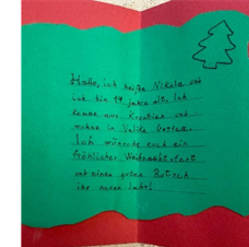 Već peti Božić za redom razmjenjujemo božićne čestitke s drugim školama. Učenici u sklopu nastave njemačkog jezika pišu čestitke u kojima se predstavljaju. Zatim slijedi nestrpljivo iščekivanje povratne pošte, a pokoje čestitke stignu i tek nakon zimskih praznika. No, to nije šteta, jer nam zakašnjela pošta produljuje duh Božića i zajedništva. Sudionici projekta ove godine bili su: OŠ Žitnjak i OŠ Alojzija Stepinca, Zagreb, OŠ Bistra, Donja Bistra, OŠ Sveta Nedelja i OŠ Vladimira Deščaka, Sv. Nedelja, OŠ I. B. Mažuranić, Prigorje Brdovečko, OŠ Luka, Luka, OŠ Ante Kovačića, Marija Gorica, OŠ Antuna Augustinčića, Zaprešić, OŠ Slavka Kolara, Kravarsko, te SŠ Konjščina i Gimnazija Velika Gorica.